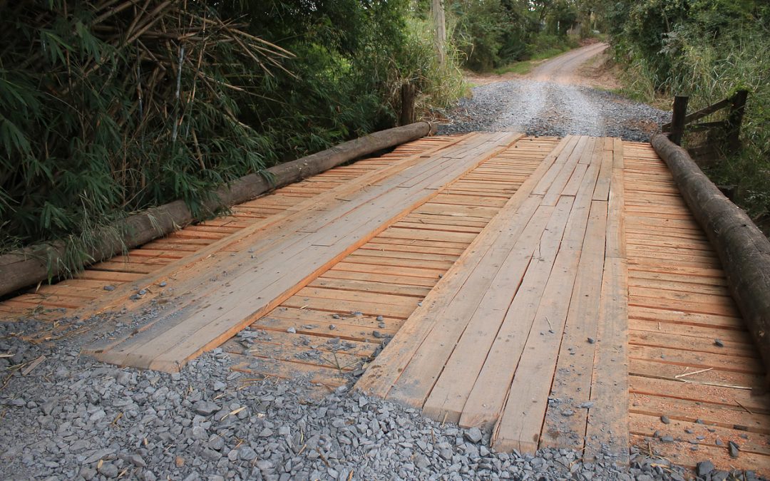 Conforme o diretor, a estrutura da ponte é formada pelo tabuleiro, no sentido transversal. Acima do tabuleiro, fica o rodeiro, também conhecido como “rastilho”, no sentido longitudinal, por onde as rodas dos veículos passam. “Isso para distribuir melhor a carga na estrutura da ponte”, ressalta. Além disso, dois troncos de eucalipto são colocados nas bordas da ponte, para proteção dos motoristas. A edificação é denominada ‘bate-rodas’.