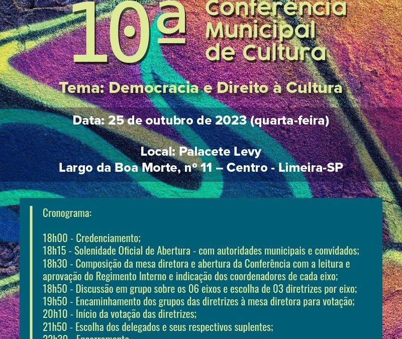 Trazendo o tema “Democracia e Direito à Cultura”, a 10ª Conferência Municipal de Cultura acontece na próxima quarta-feira (25), no Palacete Levy, às 18h. O objetivo é promover a discussão dos eixos da 4ª Conferência Nacional de Cultura com elaboração de diretrizes e eleição dos representantes/delegados para a Conferência Estadual de Cultura, além de construir uma política sociocultural que fortaleça a democracia participativa. A realização é da Prefeitura de Limeira, por meio da Secretaria de Cultura, através do Conselho Municipal de Política Cultural de Limeira.