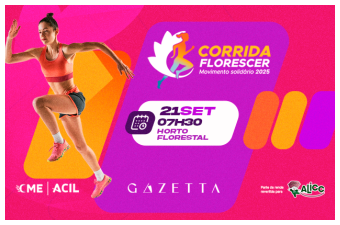 No dia 21 de setembro, o Horto Florestal será palco da Corrida Florescer 2025, uma realização do Conselho da Mulher Empreendedora, o CME da ACIL, que une saúde, bem-estar e solidariedade. O evento terá início às 7h30 e promete reunir famílias inteiras em uma manhã de diversão e celebração da vida.